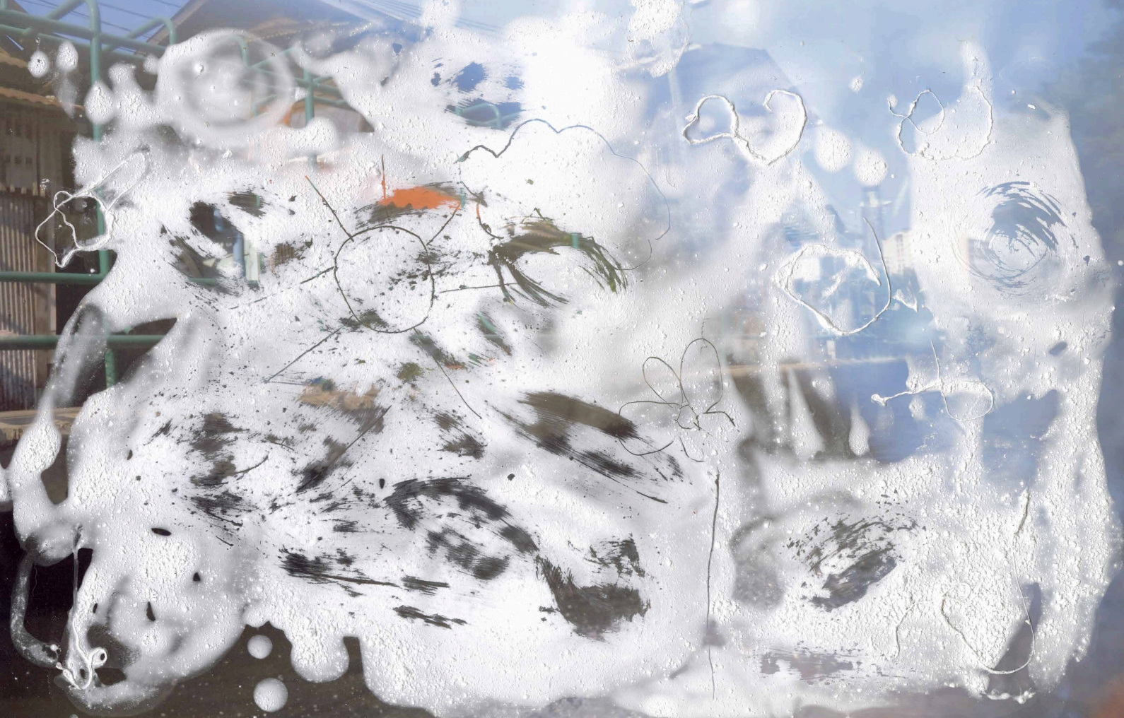Lou a pensé pour cet accrochage à deux tirages photographiques où elle a dessiné par dessus avec du plâtre au doigt. Ce processus a pour volonté de représenter son cheminement de pensée concernant l’imagination d’un paysage étranger, prenant place dans un autre monde. Comment décrire une image que l’on n’a jamais vue? C’est la question qui l’a poussé à dessiner sans couleur, sur un fond de ce qu’elle connaît déjà. Elle constitue ces visuels comme elle pense que l’inconscient créer des images nouvelles à partir de ce que le conscient a déjà intégré. Sur ces deux photographies, les couleurs personnalisent notre monde, celui q’elle connait, tandis que le blanc du plâtre représente le monde inexploré, qui lui n’a pas de forme concrète.