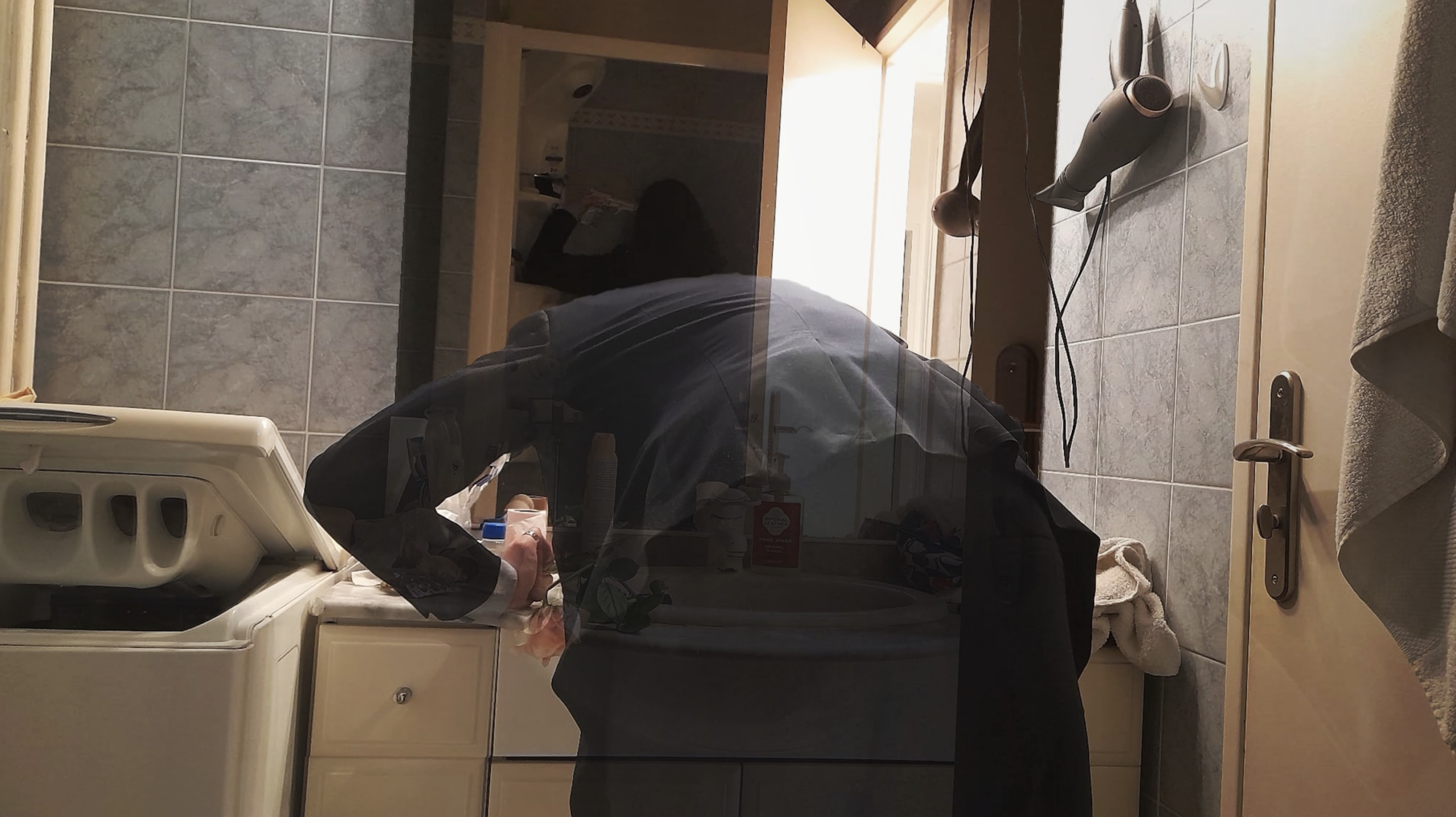Une femme en tailleur affalée sur un lavabo de salle de bain. Le poing serré. Luttant contre