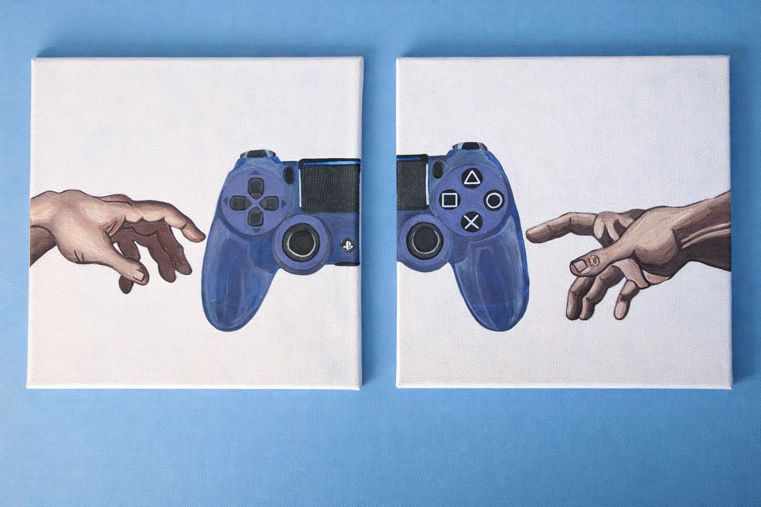Cette œuvre s’inspire de la célèbre rencontre des mains dans La Création d’Adam de Michel-Ange. L’espace entre les deux mains est occupé par une manette de PlayStation violette. Objet familier du quotidien, elle devient un symbole de transition : un point de passage entre deux réalités.